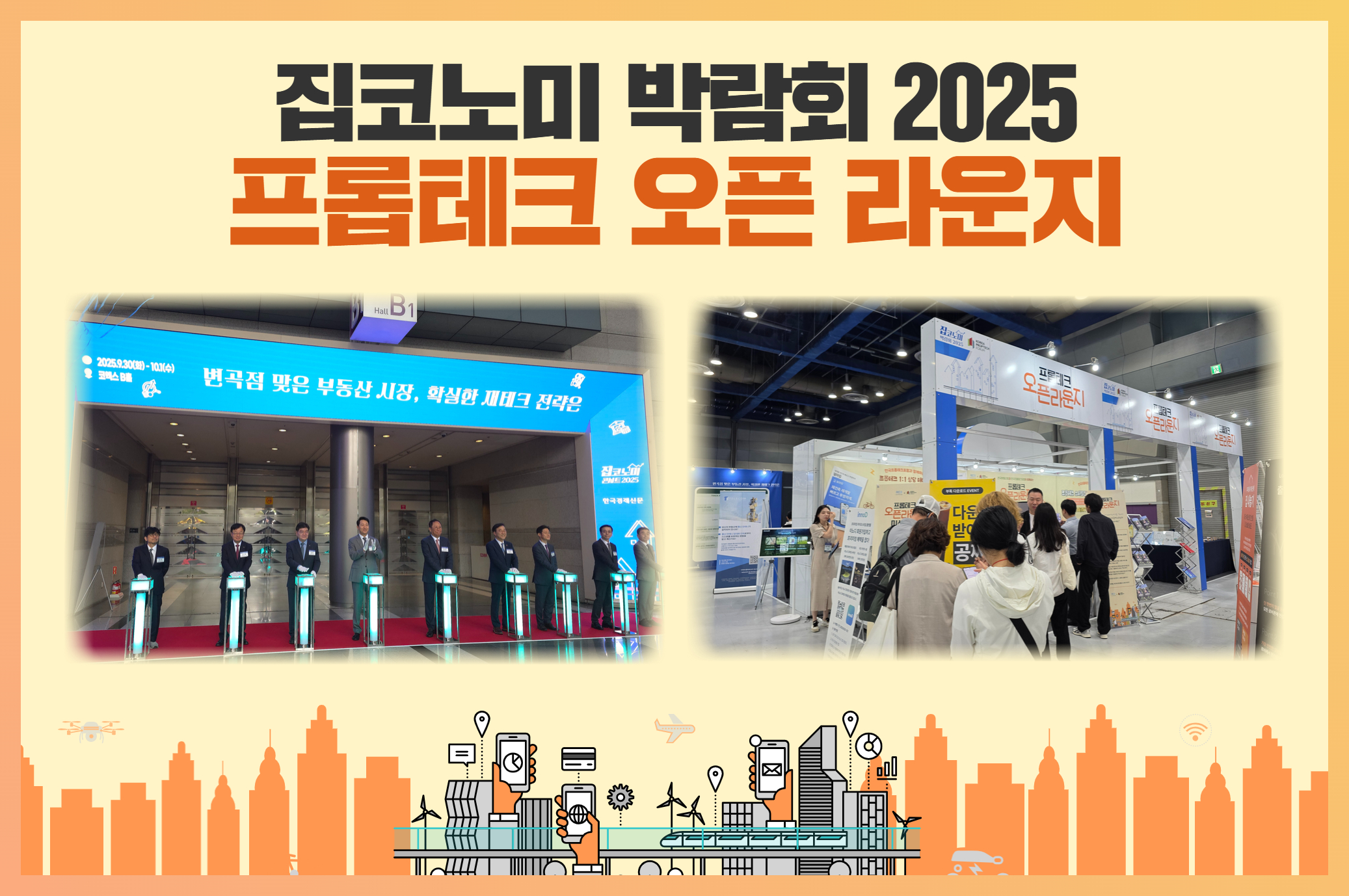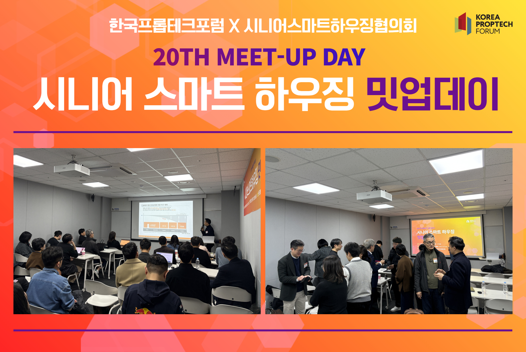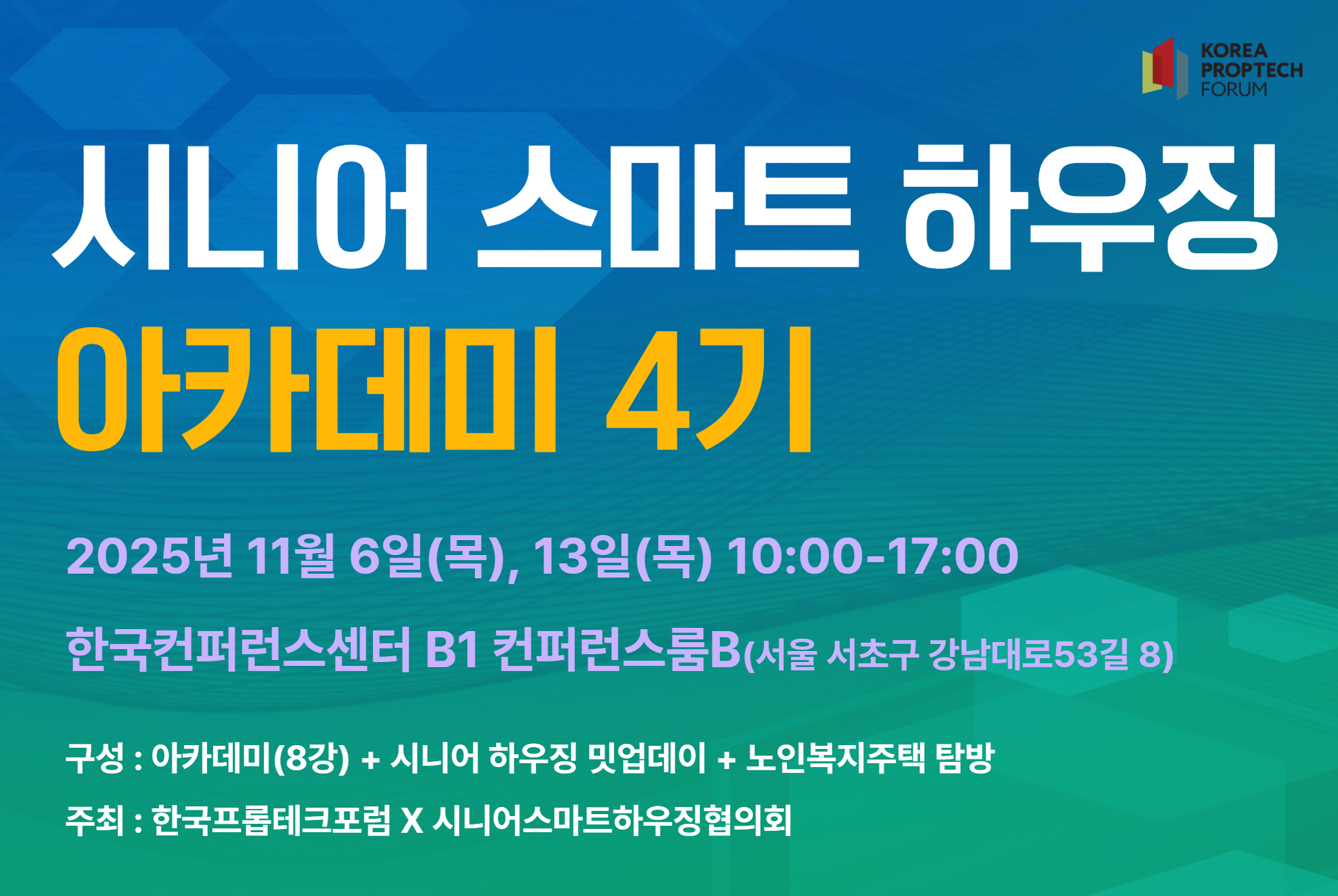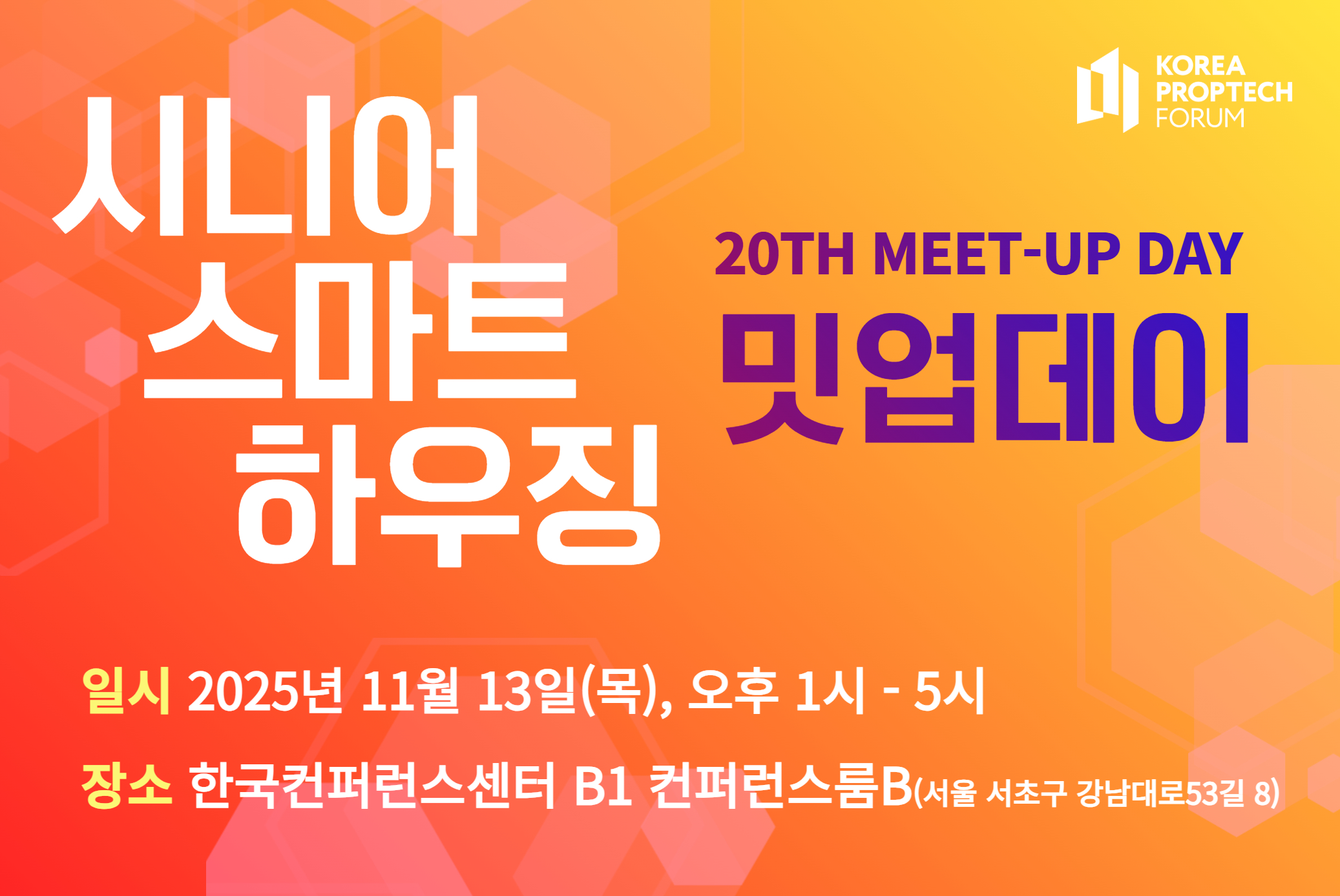 Notice View More 2025년 제2차 부동산 데이터 아카데미 안내 2025.11.21 제20회 밋업데이 '시니어 스마트 하우징 밋업데이' 성료 2025.11.14 2025 프롭테크인의 밤 참가 신청 2025.10.29 시니어 스마트 하우징 밋업데이(Meet-Up Day) 개최 안내 2025.10.15 집코노미 박람회 2025, "프롭테크 오픈 라운지" 성료 2025.10.01 시니어 스마트 하우징 아카데미 4기 안내 2025.09.26